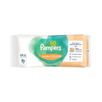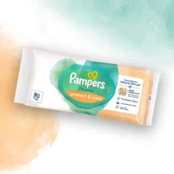 دستمال مرطوب کودک پمپرز مدل Protect & Care با ترکیبات کاملاً طبیعی و استانداردهای اروپایی تولید شده تا پاکیزگی و لطافت پوست فرزند شما را تضمین کند.