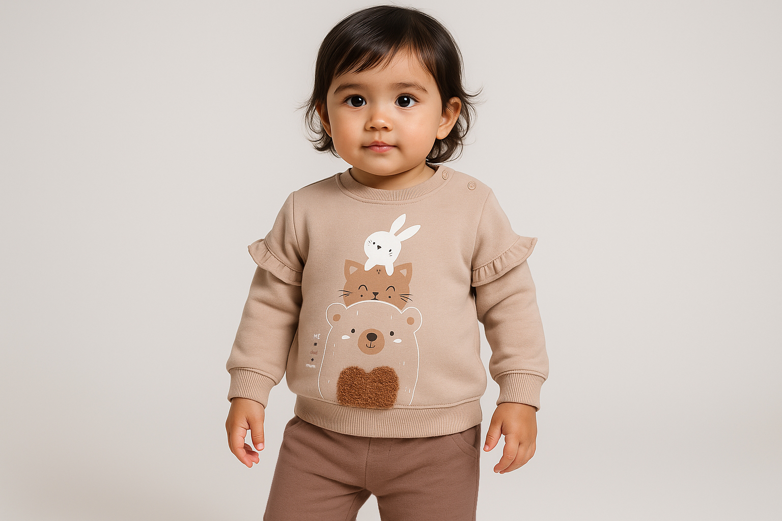ست Anida از برند Papo، ترکیبی از طراحی لطیف دخترونه و راحتی روزمرهست 👧💖 پارچه نخپنبهای ضدحساسیت و دوخت تمیز، این لباس رو برای استفاده مداوم مناسب کرده. رنگبندی جذاب و طرح دخترونهاش استایل شاد و کودکانه میده.
